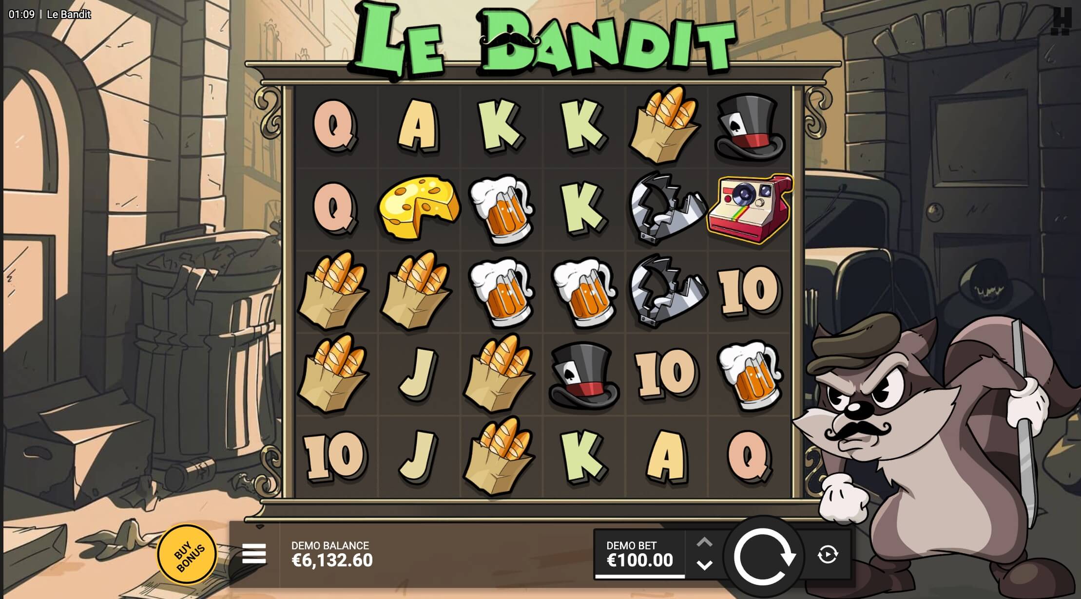 Grafiken i bakgrunden av Le Bandit-slots är genomarbetad och väldesignad, men skyltarna, som baguette, ost, öl och fångster, är ganska grundläggande.